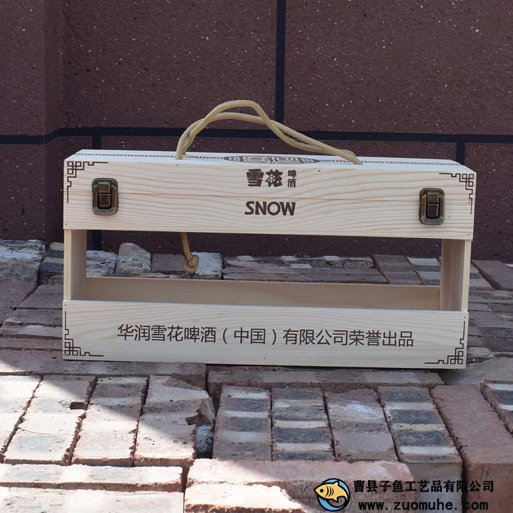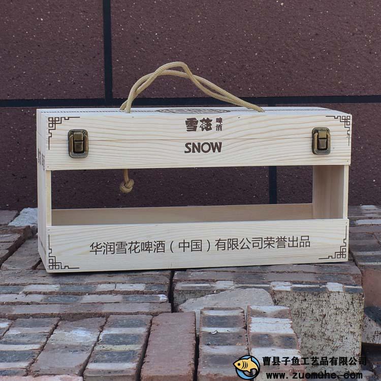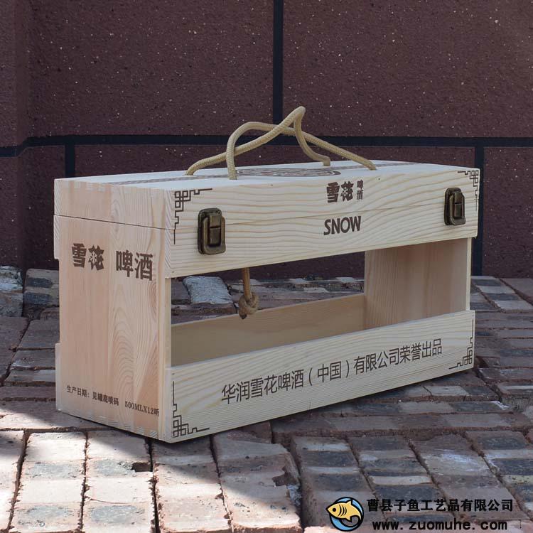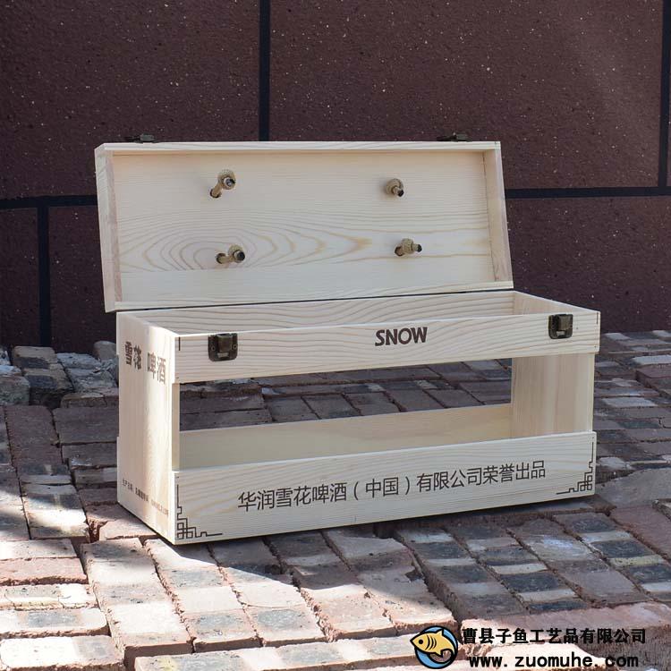 這是一款采用松木制作的啤酒木盒,一箱可以裝12聽易拉罐雪花啤酒,高檔大氣,精簡的禮品盒。
